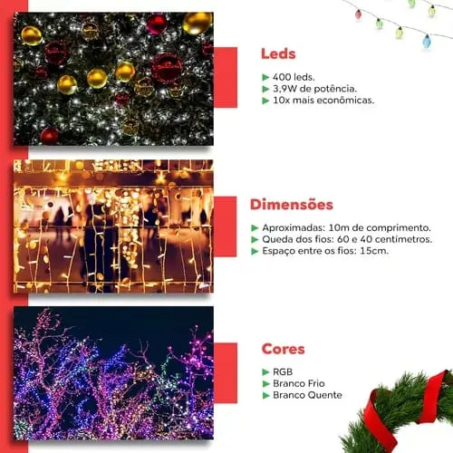 - Palavras-chave secundárias: luzes de LED natalinas, decoração com pisca pisca, cascata de luzes, iluminação natalina branca quente, pisca pisca para jardim